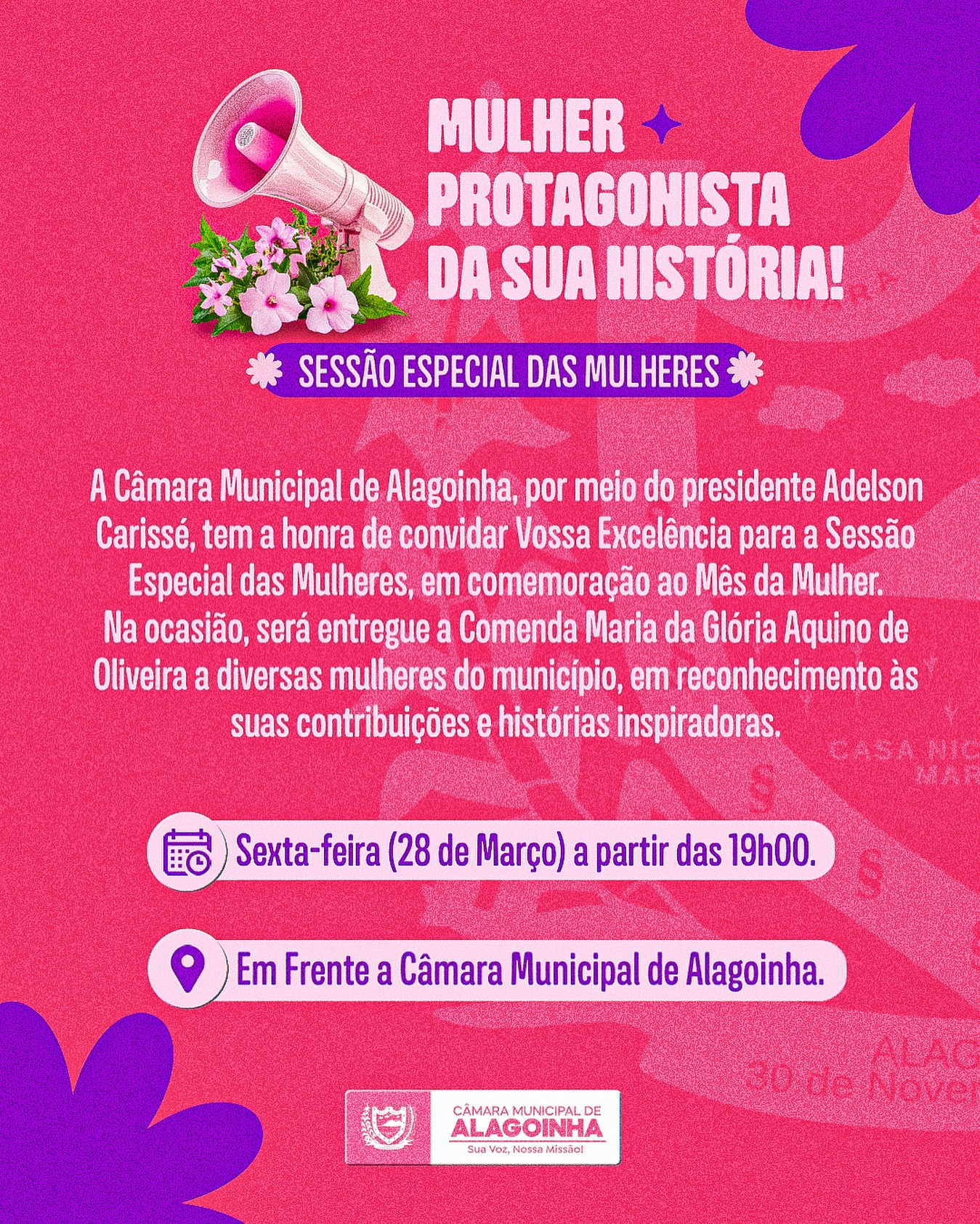 A Câmara Municipal de Alagoinha realizará na próxima sexta-feira, 28 de março de 2025, às 19h, uma sessão especial intitulada “Mulheres Protagonistas da Sua História”, em homenagem ao Dia Internacional da Mulher. O evento ocorrerá em frente à sede do legislativo municipal.